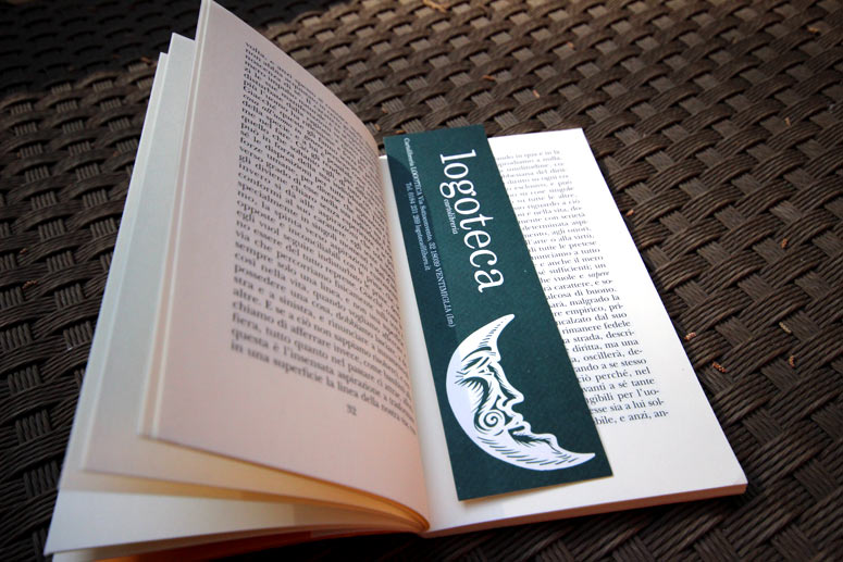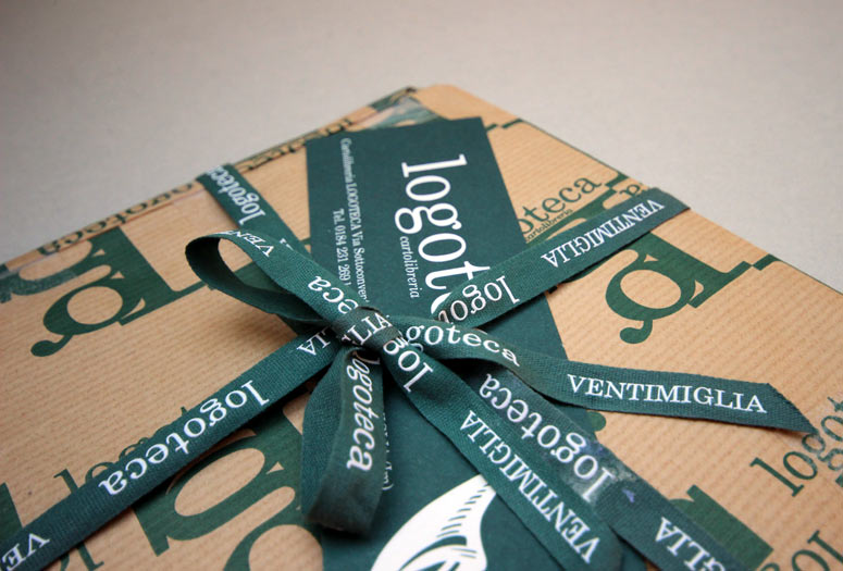 Realizzazzione immagine coordinata per la cartolibreria Logoteca di Ventimiglia. CR&A OFFICINA ha ideato il logo, la carta per imballo, il nastro con rilievo ed il segnalibro.