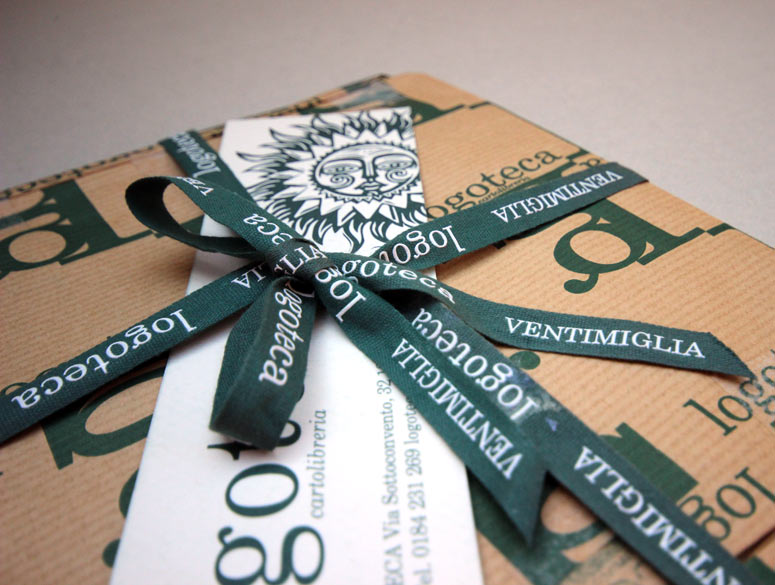 Realizzazzione immagine coordinata per la cartolibreria Logoteca di Ventimiglia. CR&A OFFICINA ha ideato il logo, la carta per imballo, il nastro con rilievo ed il segnalibro.